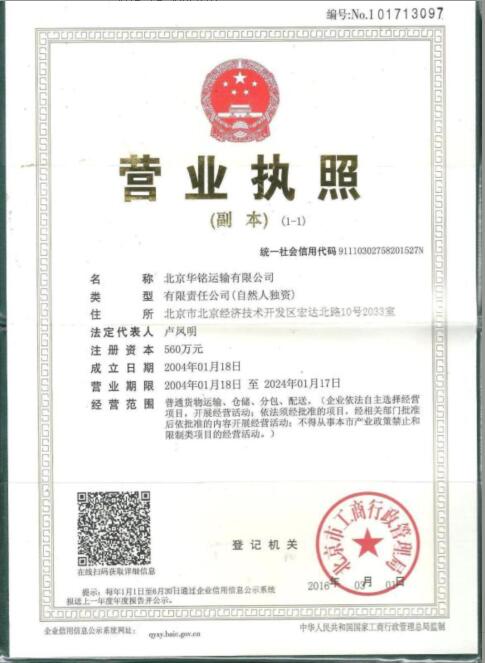 北京華銘運(yùn)輸有限公司,于2004年經(jīng)北京市工商局批準(zhǔn)注冊的有限責(zé)任公司(自然人獨資),注冊資金4560萬,總部位于北京,服務(wù)范圍遍及中國大陸地區(qū),核心業(yè)務(wù)包括物流運(yùn)輸,倉儲,包裝及供應(yīng)鏈解決方案,為各行業(yè)、各類型商品、輔助品、半成品及原材料提供高品質(zhì)的專業(yè)物流服務(wù)。